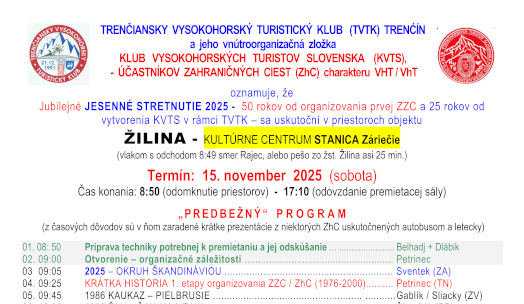 Areál vynovenej Základnej Umeleckej Školy (ZUŠ) v Kysuckom Novom Meste "hostil" takmer 100 členov komunity vysokohorských turistov - účastníkov zahraničných ciest charakteru VhT (ZhC) voľne združených v Klube Vysokohorských Turistov Slovenska (KVTS), vytvorenom ako vnútroorganizačná zložka Trenčianského Vysokohorského Turistického Klubu (TVTK), ktoré už viac než 40 rokov pripravuje Maroš Petrinec (inštruktor VhT) a predseda TVTK Trenčín. V netypicky teplom, ale hmlistom počasí...